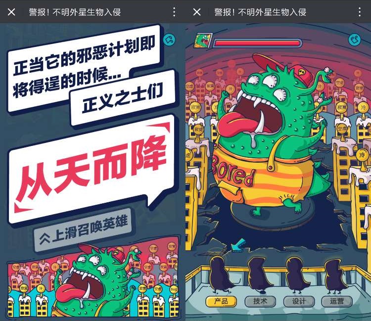 帶入一個富有創意的主題可以為招聘H5內容加分,比如口碑ued的“警告!不明外星生物入侵”。通過帶入外星生物和超級英雄主題,將求職者的形象帶入到場景角色中,增加了趣味性和代入感,也體現了公司多彩的文化。