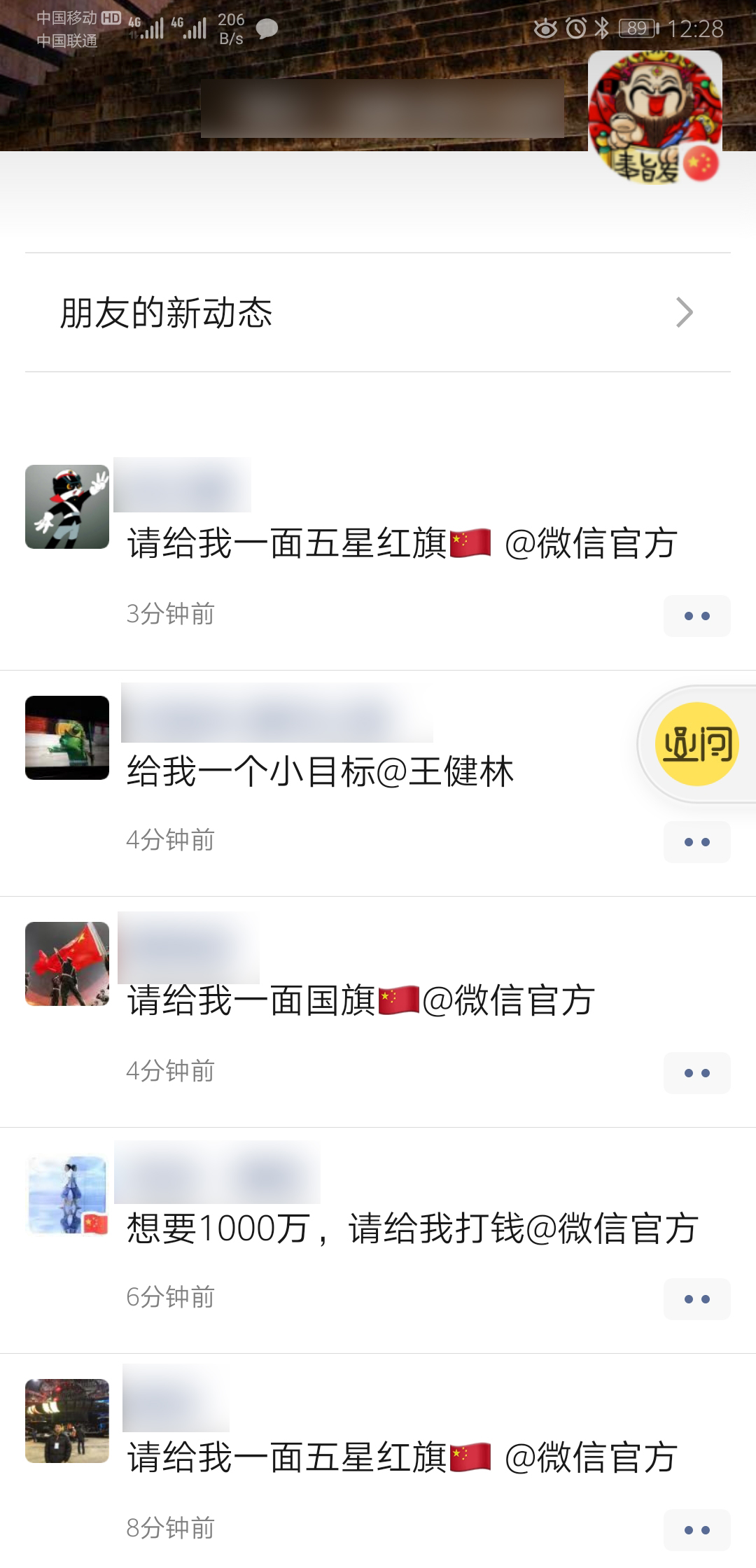 今日上午(19年9月24日),微信朋友圈有用戶發布了一則“給我一面國旗@微信官方”的動態,隨后該動態形成刷屏效應,不少用戶紛紛轉發。迅速形成霸屏效應。
